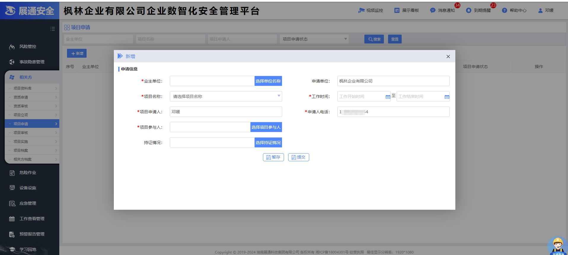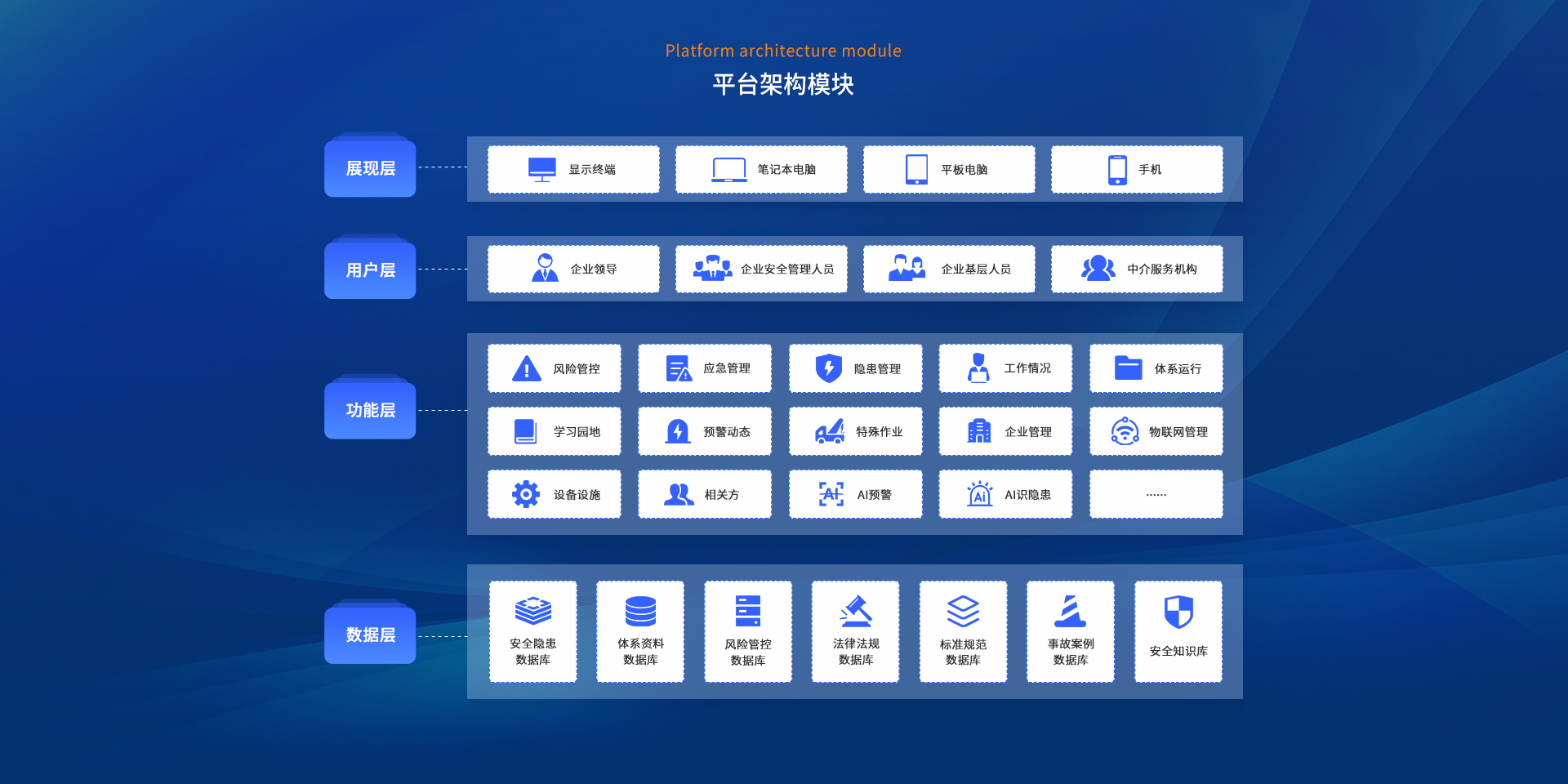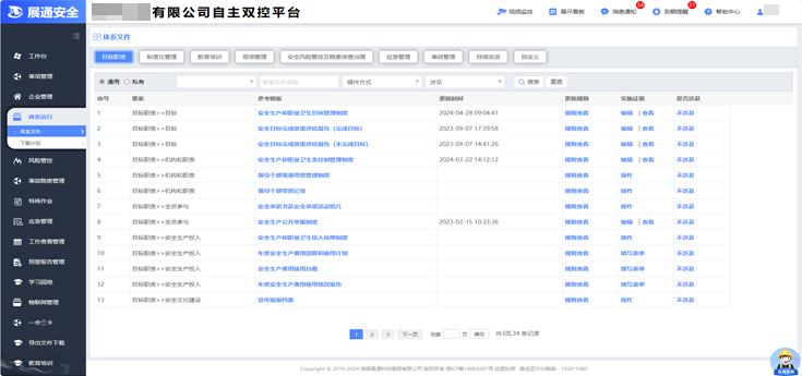 企业数智化安全管理平台(俗称企业端)汇集企业管理、风险管控、隐患管理、体系运行、危险作业、AI预警、AI识隐患、应急管理、预警动态、一会三卡、物联网管理、相关方、设备设施、学习园地等功能于一体,旨在构建标准化、规范化、便捷化的管理流程,引导企业自主开展安全管理工作,建立健全全员安全生产责任制,全面提升企业安全管理数智化水平。