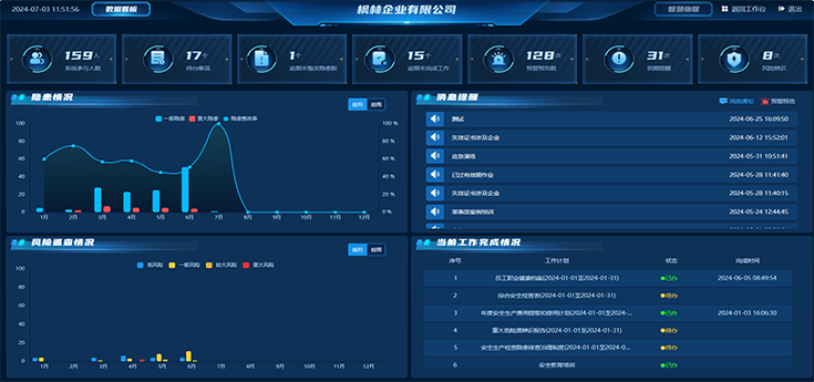 构建可视化数据中心看板集成汇总企业安全生产运行数据,涵盖隐患情况、风险巡查情况、工作完成情况、预警预告情况、到期提醒、物联报警等,便于负责人全盘掌握企业安全管理动态。