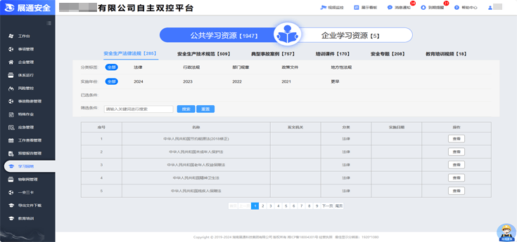 平台配置法律法规、技术规范、典型事故案例、安全专题、培训课件等多个维度学习资料,并定期更新。企业可根据需要自主下载,也可上传本单位学习资料,提高安全管理专业知识与技能水平。