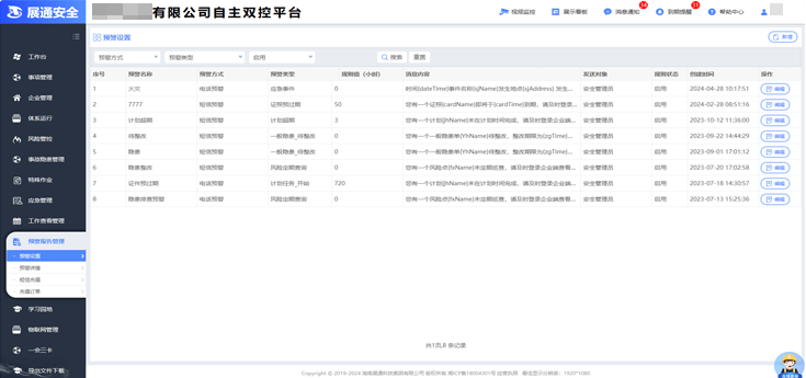 平台提供隐患管理超期、证照(预)超期、工作计划实施、风险定期巡检、物联感知、应急事件等多方面的预警,依需设置预警规则,支持短信、电话、微信等多途径消息推送,实时提醒相关责任人进行处理;