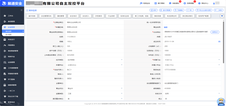系统提供企业基本信息、安全管理架构、安全投入、涉危情况、行业资质、安全培训、职业卫生、涉尘涉爆、有(受)限空间、第三方检测、检验等15个功能模块,可根据企业实际情况进行选用。